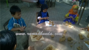 Tempat pertama yang kami masuki adalah Rumah Gerabah. Disini kami membuat kreasi clay dari tanah liat. Rumah Gerabah ini letaknya outdoor, di luar gedung. Bersama beberapa pemandu, anak-anak mengerjakan clay mereka masing-masing. Sebelum bekerja, anak-anak memakai apron agar baju tidak belepotan kena tanah liat. Eww…seperti mainan playdoh. Untuk anak seusia Alifa, kreasi clay ini bagus untuk mengasah motorik halus sekaligus seni. Tak berapa lama, anak-anak pun nampak mulai bosan dan ingin segera pindah. Maka kreasi clay pun disudahi. Clay yang ada bisa dibawa pulang untuk dilanjutkan di rumah.